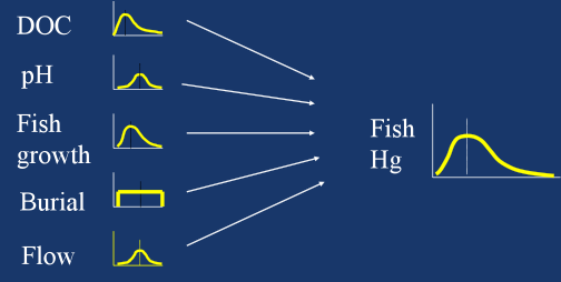 To help address this problem, a model approach was developed that was designed to predict the distribution of fish mercury levels that exist within a region, and how this distribution would change through time if mercury deposition changed or large scale regional changes occurred for factors such as acid deposition or temperature. In a prototype study funded by the US EPA, this model was coupled with a national scale atmospheric mercury deposition model to examine the potential response of different regions to emissions controls.